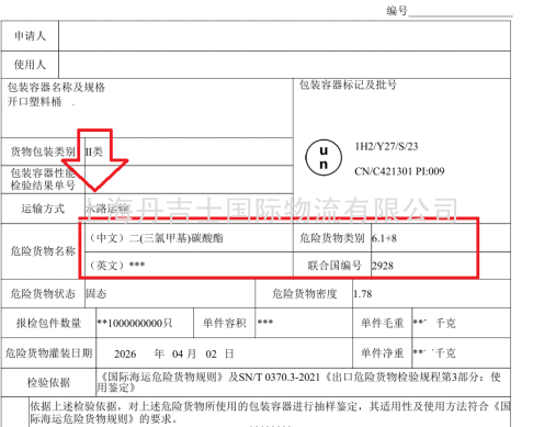 危险类别:6.1(毒性物质) 和 8(腐蚀性物质)