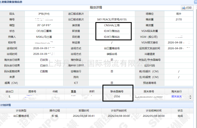 从上海港驶往印尼雅加达港,品名为UN3556 CLASS 9危险品。